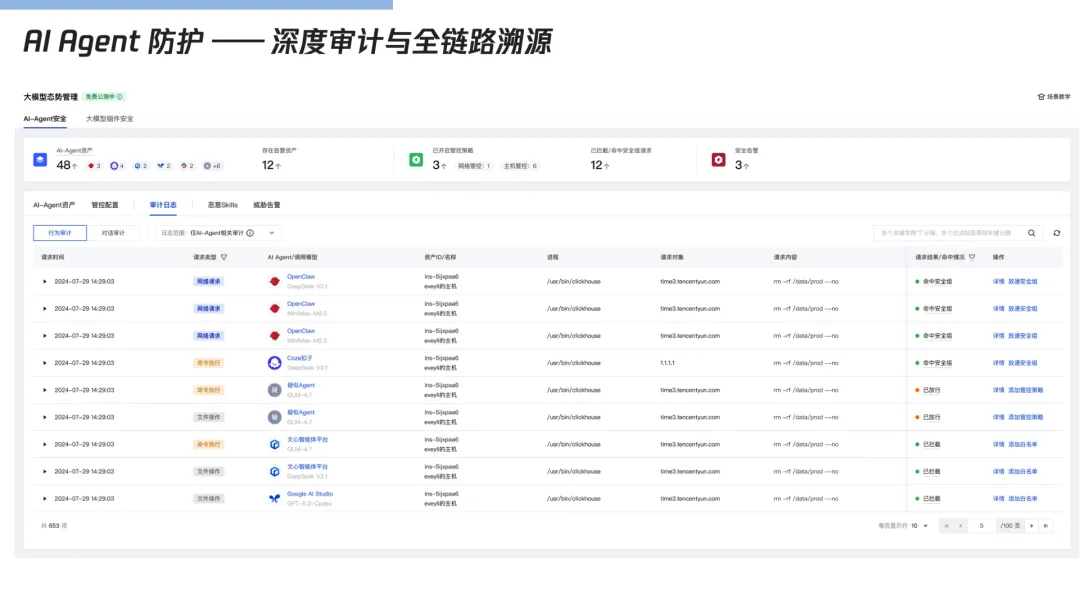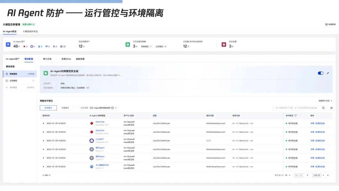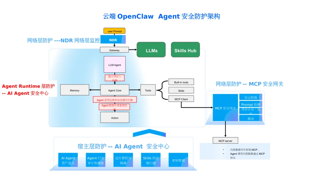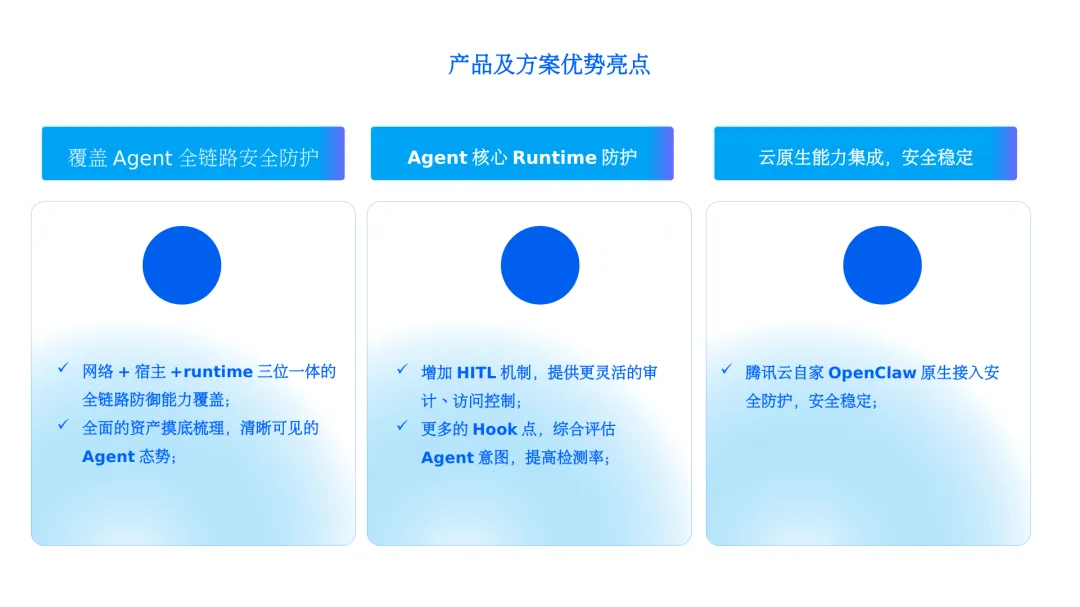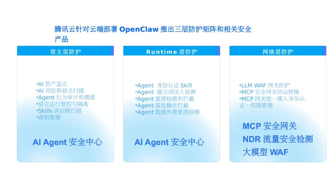 导读:OpenClaw 在快速普及过程中暴露出多重安全隐患,默认配置存在沙箱关闭、敏感信息明文存储、外部监听等风险。社区发生大规模技能供应链投毒事件,恶意组件可实现远程控制与信息窃取。系统面临提示词注入、权限过高、数据泄露、插件不安全、供应链漏洞等多重威胁,企业部署存在资产不明、行为难控、合规难管等问题。腾讯云推出云端 OpenClaw 三位一体安全防护架构,覆盖宿主层、运行时层与网络层。AI Agent 安全中心实现资产盘点、风险扫描、行为审计与全链路溯源,对恶意技能进行实时检测。运行时层完成提示词攻击检测、高危操作拦截、数据外泄意图识别。网络层通过 MCP 安全网关与 LLM WAF 实现身份认证、协议转换、攻击防护与流量管控。方案构建全流程安全管控体系,强化人工干预机制,规范权限边界,为企业部署 OpenClaw 提供稳定可靠的安全支撑,保障 AI 智能体在合规可控环境下运行。