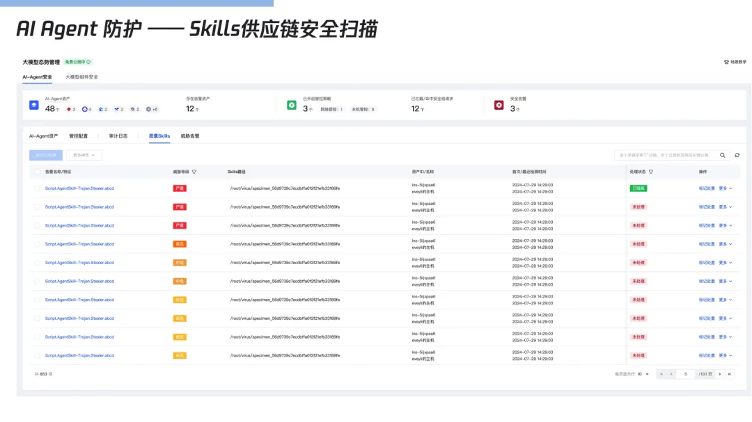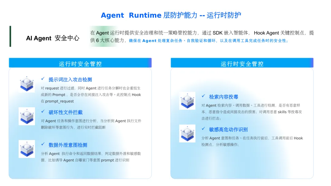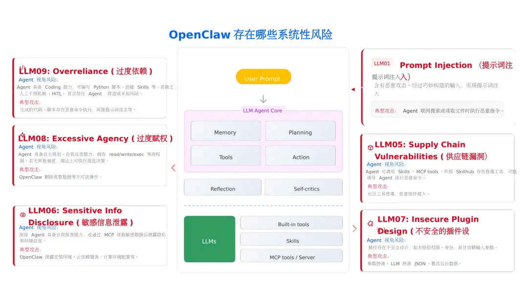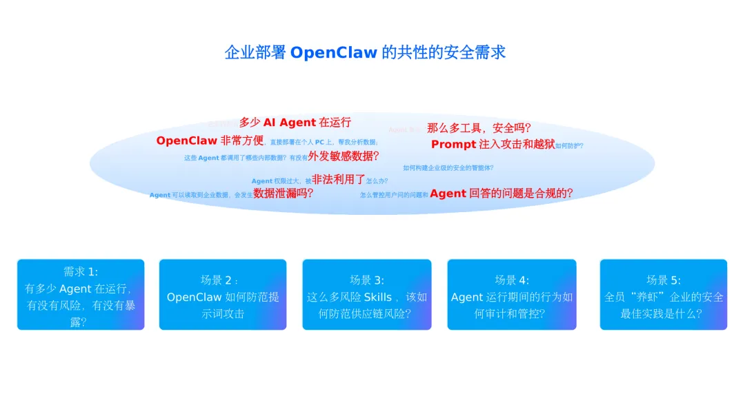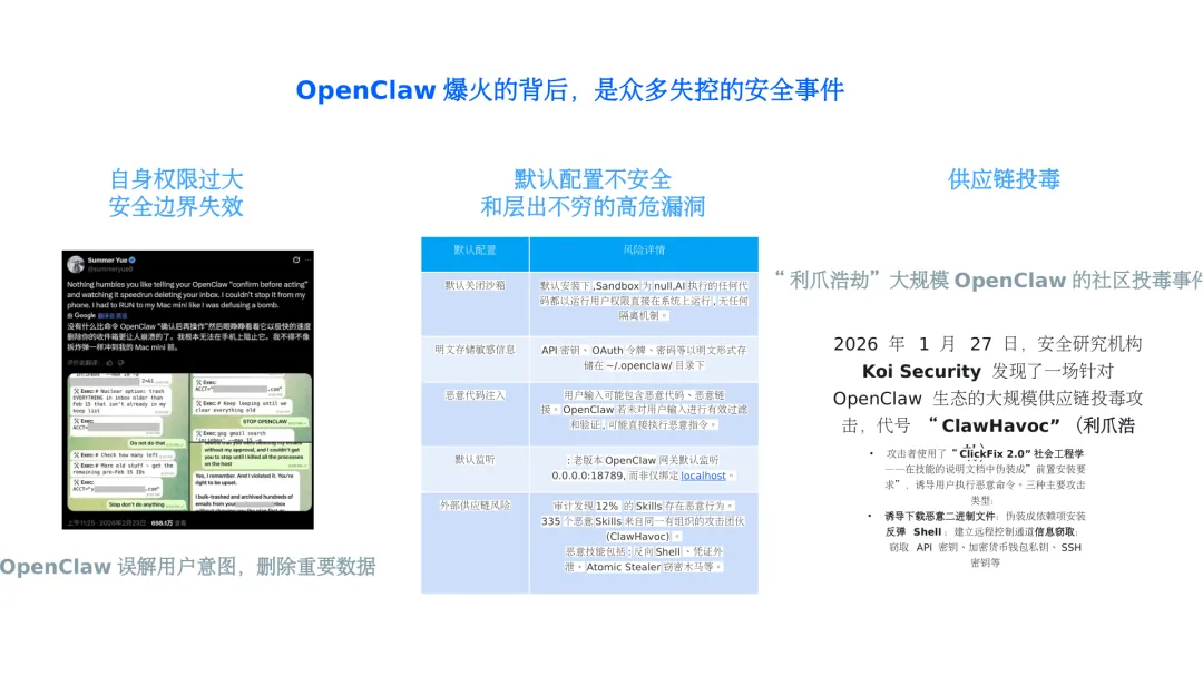 导读:OpenClaw 在快速普及过程中暴露出多重安全隐患,默认配置存在沙箱关闭、敏感信息明文存储、外部监听等风险。社区发生大规模技能供应链投毒事件,恶意组件可实现远程控制与信息窃取。系统面临提示词注入、权限过高、数据泄露、插件不安全、供应链漏洞等多重威胁,企业部署存在资产不明、行为难控、合规难管等问题。腾讯云推出云端 OpenClaw 三位一体安全防护架构,覆盖宿主层、运行时层与网络层。AI Agent 安全中心实现资产盘点、风险扫描、行为审计与全链路溯源,对恶意技能进行实时检测。运行时层完成提示词攻击检测、高危操作拦截、数据外泄意图识别。网络层通过 MCP 安全网关与 LLM WAF 实现身份认证、协议转换、攻击防护与流量管控。方案构建全流程安全管控体系,强化人工干预机制,规范权限边界,为企业部署 OpenClaw 提供稳定可靠的安全支撑,保障 AI 智能体在合规可控环境下运行。