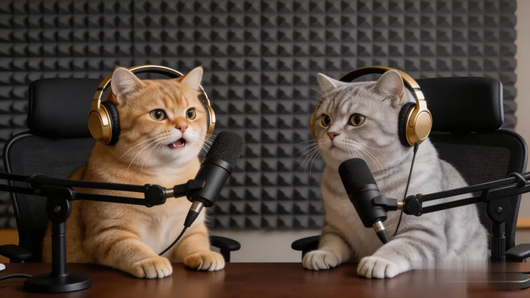 写实风格,两只圆胖英国短毛猫在专业录音室录播客:一只金渐层(橘色),一只银渐层(灰色)。两只猫都戴着金色头戴式耳机,坐在黑色办公椅上,前爪搭在桌面。桌上各有一个黑色悬臂麦克风,对准猫嘴。背景是深灰色声学泡沫隔音板。金渐层嘴巴微张,像要说话的样子,银渐层眼睛睁得圆圆的,在听。画面清晰生动,比例16:9。