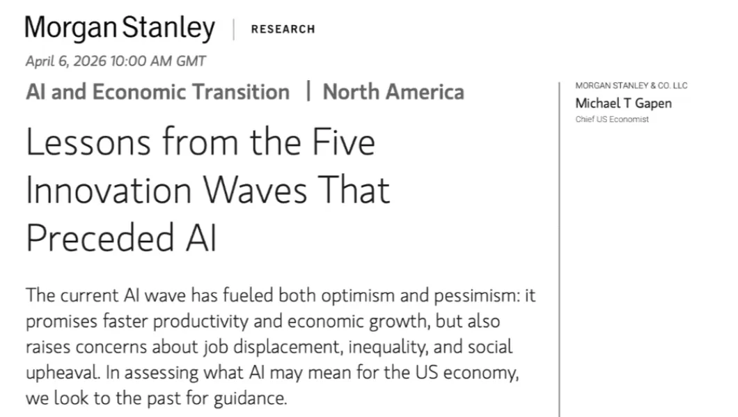 今天,我要和大家好好聊聊“周期”。最近,大摩发布了一份长达40多页的重磅深度研报。这份报告没有去枯燥地预测明天的股价涨跌,而是把过去250年人类经历的五次技术革命扒了个底朝天,并以此来推演我们眼下正在经历的第六次大爆发——AI(人工智能)革命。