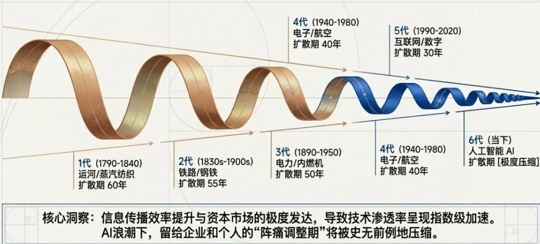 - 第五次浪潮(互联网与数字网络): 从1990年到2020年,仅仅30年,就彻底重塑了全球商业版图。