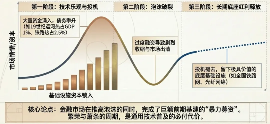 盛运君点评: 现在的AI浪潮一模一样。大厂们正在疯狂砸钱买英伟达的显卡、建数据中心和算力中心,这就跟当年疯狂修铁路完全是一个路数! 大量热钱一窝蜂涌入,必然会出现投机过热和剧烈的金融动荡。 作为普通投资者,我们在这一波红利中,既要敢于在泡沫初期上桌吃肉(买入核心基建和算力龙头),又要时刻保持清醒,别在泡沫破裂的末期去当接盘侠!