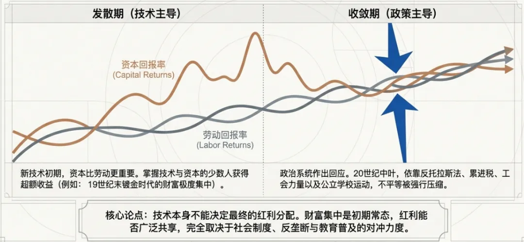 报告极其尖锐地指出:在每次创新浪潮的初期,社会财富的差距一定会先被猛烈拉大。因为资本变得无比重要,掌握新技术的少数人会率先吃掉最大的红利。