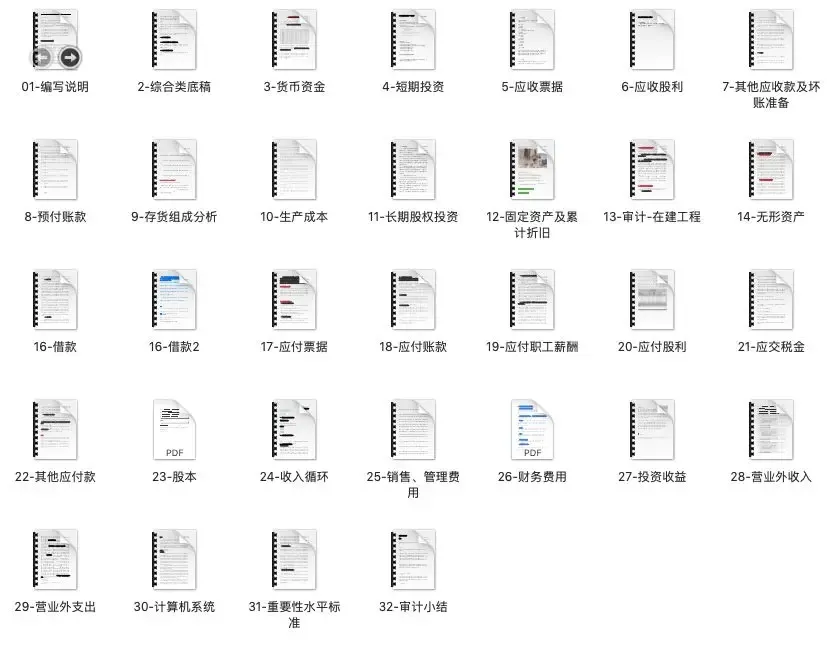 审计 | 安永200页全套审计工作底稿模板.zip审计底稿一直被作为模范!在没有考虑清楚项目的目标的情况下就一头扎入执行实质程序,格局不够高,最后得出的效果也是差强人意,内审的性质决定内审的底稿并不是像外审一样设定固定的格式去填数字。底稿的意义就是为了支撑你的工作结果,相关的文件、制度、凭证、照片、录音、视频、书面说明及测算所用的表格等等都在底稿的范围内。而在四大中,安永的底稿作业一直被业界称道。所以,小编给大家分享一份资料,就是《安永全套审计工作底稿模板》,200页财务报表审计通用工作底稿、包含资产类、负债类、权益类。帮助大家快速掌握审计知识!▼▼▼1、编写说明、综合类底稿、货币资金、短期投资、审计小结等32个模块的详细介绍。2、200页财务报表审计通用工作底稿、包含资产类、负债类、权益类。资料详情200页财务报表审计通用工作底稿!《审计工作底稿编制案例-货币资金》预览!文章篇幅有限,仅展示目录文章篇幅有限,仅展示部分领取完整版资料请扫描下方二维码