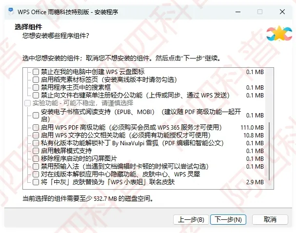 重点来了!这款版本直接给你做了极致精简,彻底告别烦人的开屏广告、弹窗推送,后台冗余全砍干净,安装就是永久专业版,不用折腾激活,低配电脑跑起来都丝滑!给大家整理了两款口碑拉满的修改版,按需选就行: MEFCL纯净版主打一个极致清爽,集成VBA宏,默认关闭云服务,安装包才487.8MB,还能自定义勾选组件,去闪屏、关广告,一键静默安装,办公室电脑装它,干净又省心;雨糖科技定制版更灵活,联网离线都能选,修复了SmartArt空白、整合模式失效的问题,登录账号还能解锁PDF全功能,想装方正公文字体、办公助手,全给你自定义空间,满足不同职场需求!