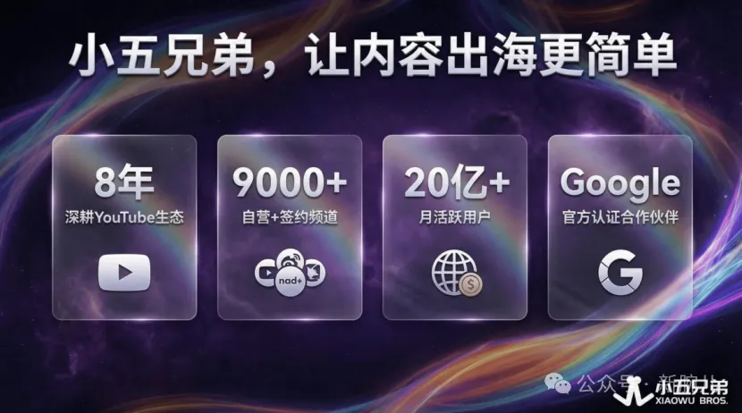 整体来说,我们的技术、产能已经完成商业闭环。小五兄弟不多说,就是“让内容出海更简单”,我们自己建立了一个油管生态,有九千条频道,订阅有20个亿,这是我们现在的成果。