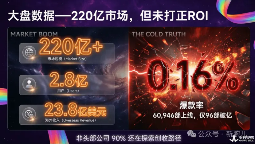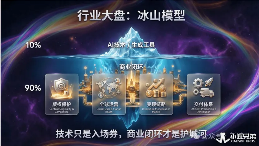技术方面,今天也有很多大佬分享,目前大模型正加速迭代中,这是一个很好的商机。但是,从小五兄弟来说,我们不是做工具,其实相当于是发行、出海、创收的企业。会看到当大家比较聚焦在AI技术、工具时,其实还有一个板块90%的人没注意,就是我们在做的事情。技术只是一个入场券,商业闭环才是大家的护城河,大家使用那么好的模型制作的内容,最重要的是出海赚美金。