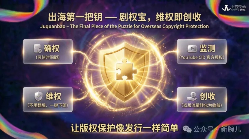 行业在商业闭环,这个也是实话实说。我们的第一把钥匙是什么?剧权宝,维权即创收。做了那么多工作,有没有考虑把作品放到油管跟脸书变现。