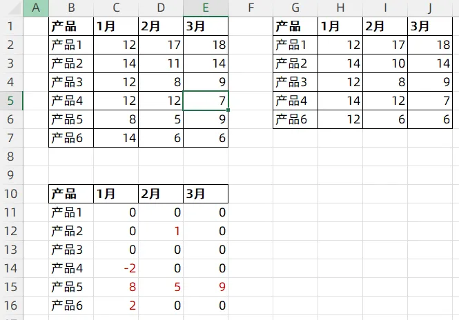 可以看到,如果两个表格的数据相同,相减之后等于0,否则不等于0。