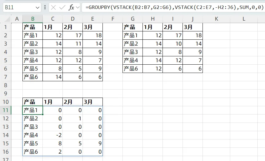 =GROUPBY(VSTACK(B2:B7,G2:G6),VSTACK(C2:E7,-H2:J6),SUM,0,0)