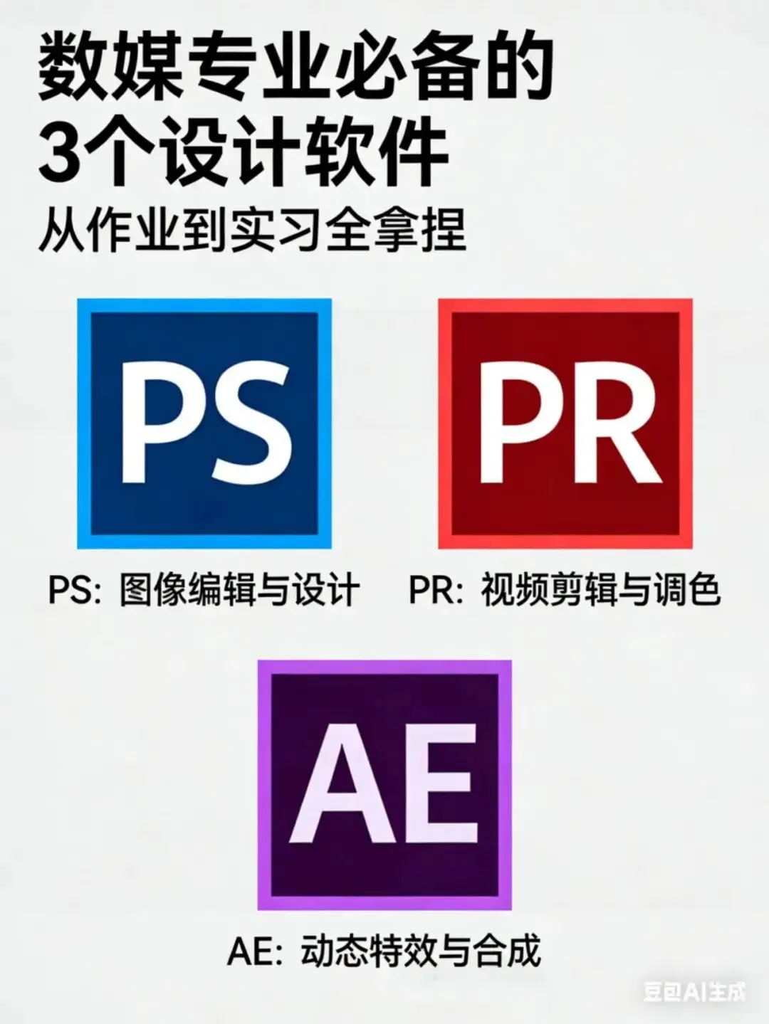 咱数媒专业,就是「设计+技术+创意」的全能选手,而PS、PR、AE,就是支撑你从课堂作业到实习项目的三大核心武器!