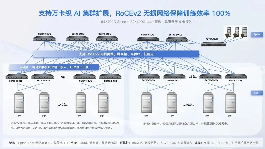 架构层面:采用64个400G端口Spine节点与32个400G端口Leaf节点两级组网,单服务器配置2张400G网卡,实现端到端400G无阻塞互联,收敛比达到1:1,整网零瓶颈。