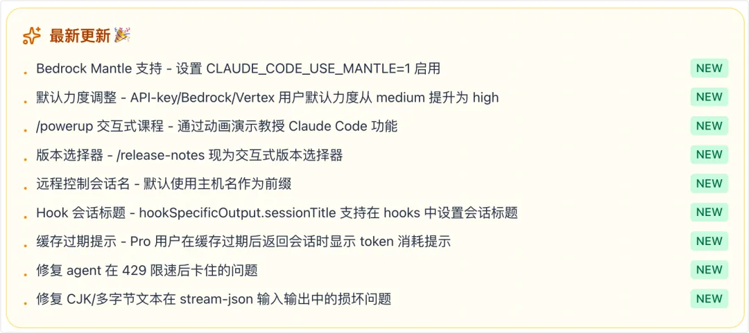 「新功能速览」:Claude Code 热点更新早知道,第一时间掌握最新功能特性和使用技巧,紧跟 AI 工具发展前沿。