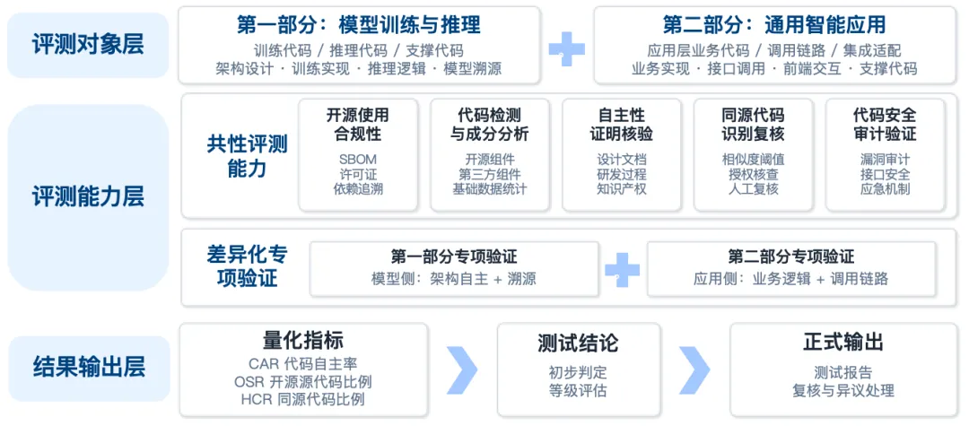 本系列规范包括《人工智能 代码自主率评估测试方法第一部分:模型训练与推理》和《人工智能 代码自主率评估测试方法 第二部分:通用智能应用》两项规范。系列标准面向人工智能系统模型侧与应用侧关键代码对象,围绕开源合规、自主证明、同源识别、代码安全、模型溯源等核心内容,构建覆盖训练代码、推理代码、业务代码、调用链路代码及集成适配代码的分层评估体系,为人工智能代码自主率评测提供统一、系统、可操作的依据。
