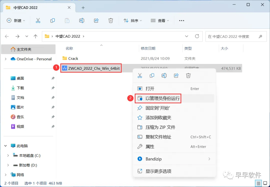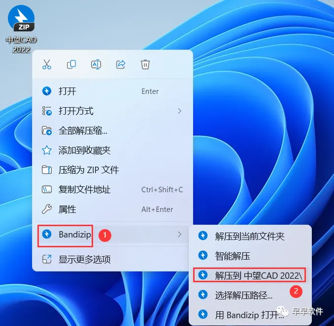 1、下载中望CAD 2022软件安装包到电脑上,右键选择【解压到中望CAD 2022\】