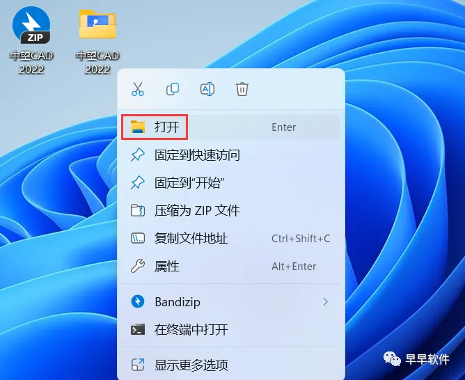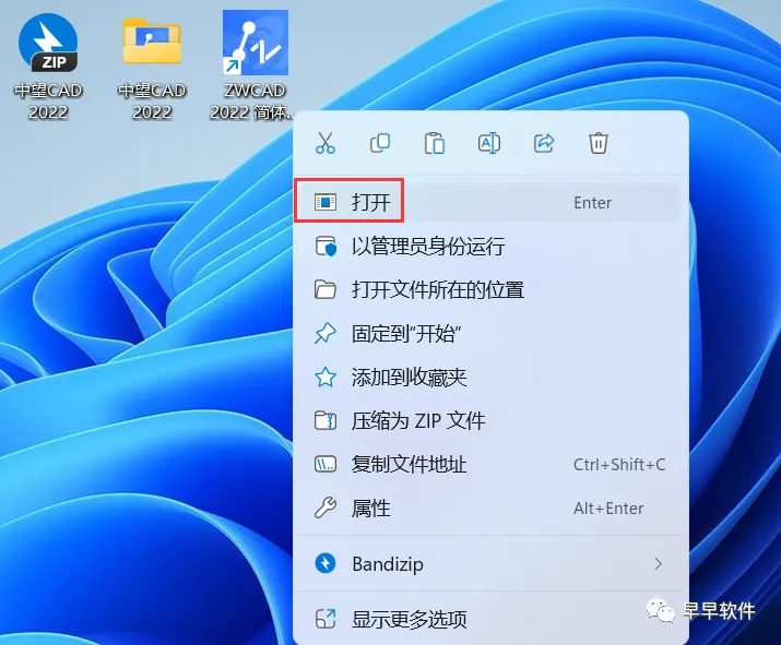 14、回到桌面,右键桌面上的【ZWCAD 2022软件图标】,点击【打开】