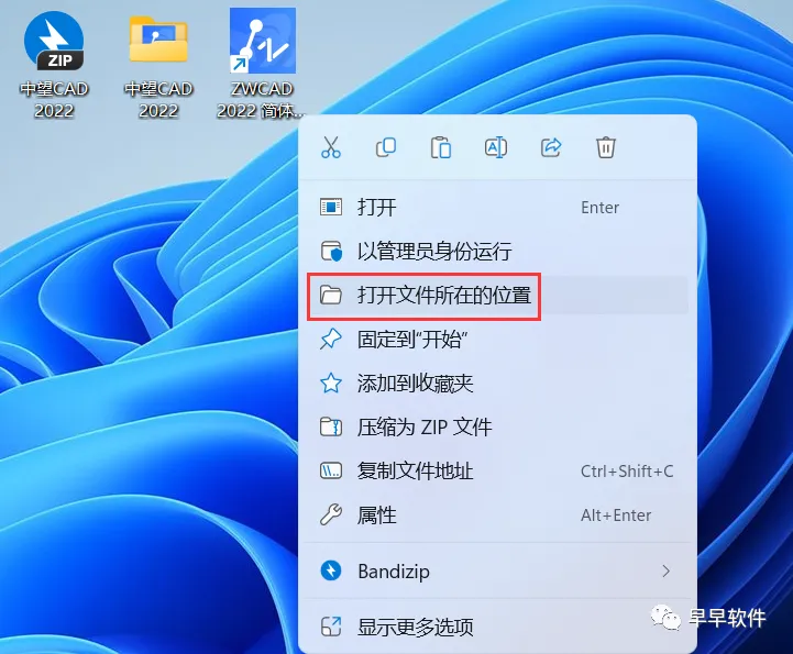10、回到桌面,右键桌面上的【ZWCAD 2022软件图标】,点击【打开文件所在的位置】