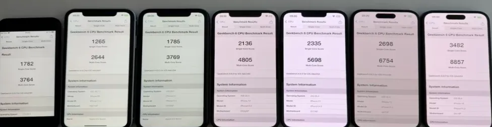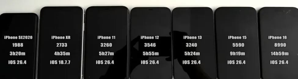 测试这边我尽量拉齐了条件,7台不同芯片的机型都上了,从A12到A18都有,屏幕亮度和音量拉到同一档,常驻的App环境也定住,刷机后放着静置一天再开跑,电量这块一看差异就出来了,几台机器能拉很开,表现分成两头走。