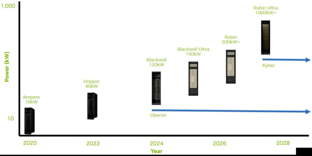 曾经处于次要地位的电力基础设施,如今其所需空间已能与计算空间相匹敌,甚至更胜一筹。随着CPU与GPU的迭代升级,GPU的热设计功耗通常会出现代际递增约20%的阶梯式增长。这导致单台服务器所需的功耗随时间推移持续攀升。英伟达的NVLink技术允许多个GPU通过网络互联,协同运作如同一颗大型同步GPU,相比基于以太网的连接方式可显着提升性能。从功耗与成本角度考量,通过铜缆实现GPU互联能获得最佳效益,但其代价是因信号完整性导致的传输距离受限。由于在有限的铜互连域内集成更多GPU可实现极致性能,最大性能实际上与最大功率密度直接挂钩。这意味着功耗增长不再局限于每代20%的幅度,随着NVLink互联域规模的扩大,功耗水平可轻松实现2倍、4倍甚至8倍的跃升。