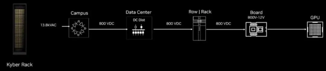 NVIDIA MGX 架构将与即将推出的 NVIDIA Kyber 机架架构一同演进,该架构旨在采用这种全新的 800 VDC 架构(见上图 )。电源以高压直接分配到每个计算节点,然后由后级高比率 64:1 LLC 转换器高效地将其降至紧邻 GPU 的 12 VDC。这种单级转换效率更高,且比传统的多级方法占用面积减少 26%,从而释放了处理器附近宝贵的空间。