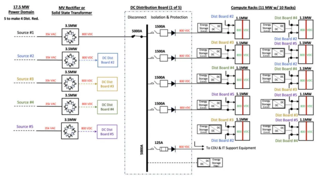 未来的愿景是将所有交流电转直流电集中在设施层面,建立本地直流数据中心。在这种方法中,中压交流电通过大型高容量电源转换系统直接转换为 800 VDC。然后,这 800 VDC 被分配到整个数据大厅的各个计算机架。该架构通过消除交流开关设备、变压器和 PDU 层级来简化动力传动系统。它最大限度地利用了用于创收计算的空白空间,简化了整个系统,并为直接集成设施级储能提供了清洁的高压直流主干网。向完全实现的 800 VDC 架构的过渡将分阶段进行,为行业提供适应的时间和组件生态系统的成熟时间。