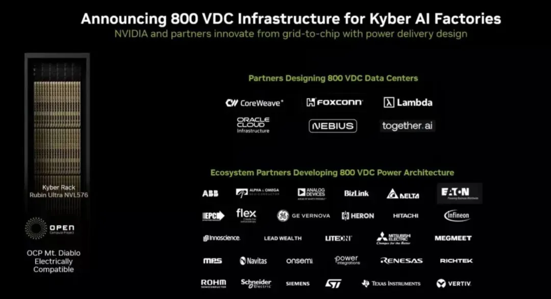 800V HVDC 架构定义者、生态盟主与标准主导方;计划 2027 年全线产品转向 800V 供电,支撑 1MW + 机架;联合上下游建立严格认证供应商联盟,推动 Kyber、Rubin Ultra、GB200 等平台规模化落地。