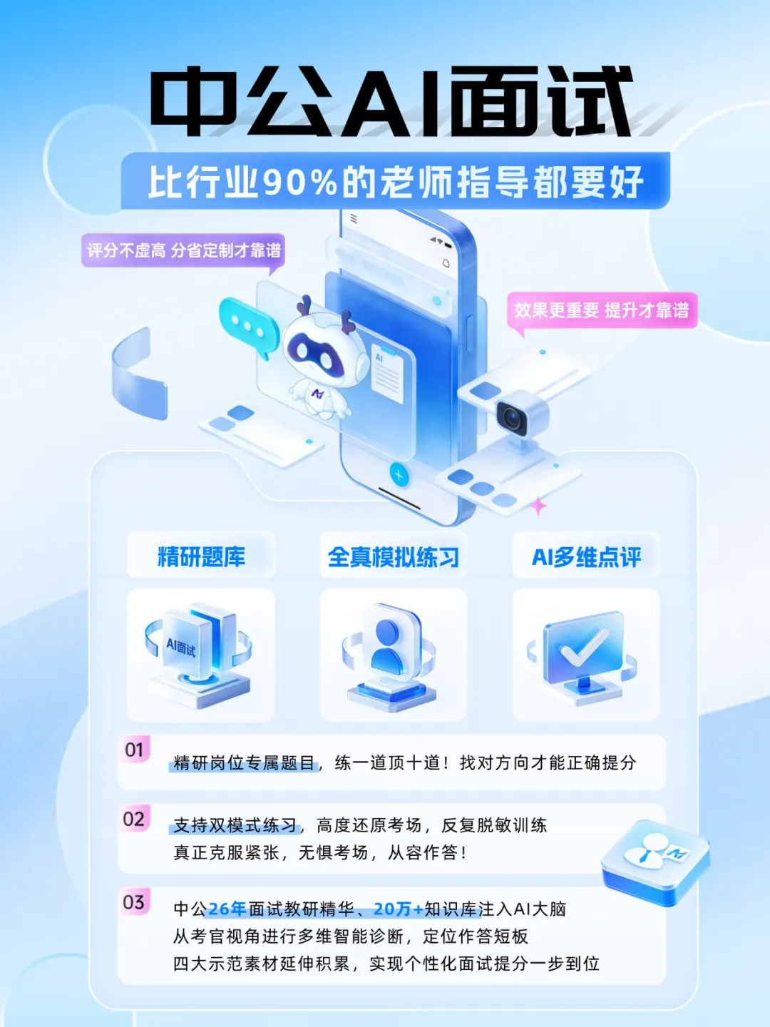 面试备考从来不靠死刷题、耗时长,核心是练对题、敢上场、会改进!中公AI面试小程序直击三大备考痛点,依托中公2026年面试教研实力,打造专业备考神器,效果赶超行业90%的普通老师,帮你备考高效避坑,面试稳稳提升!