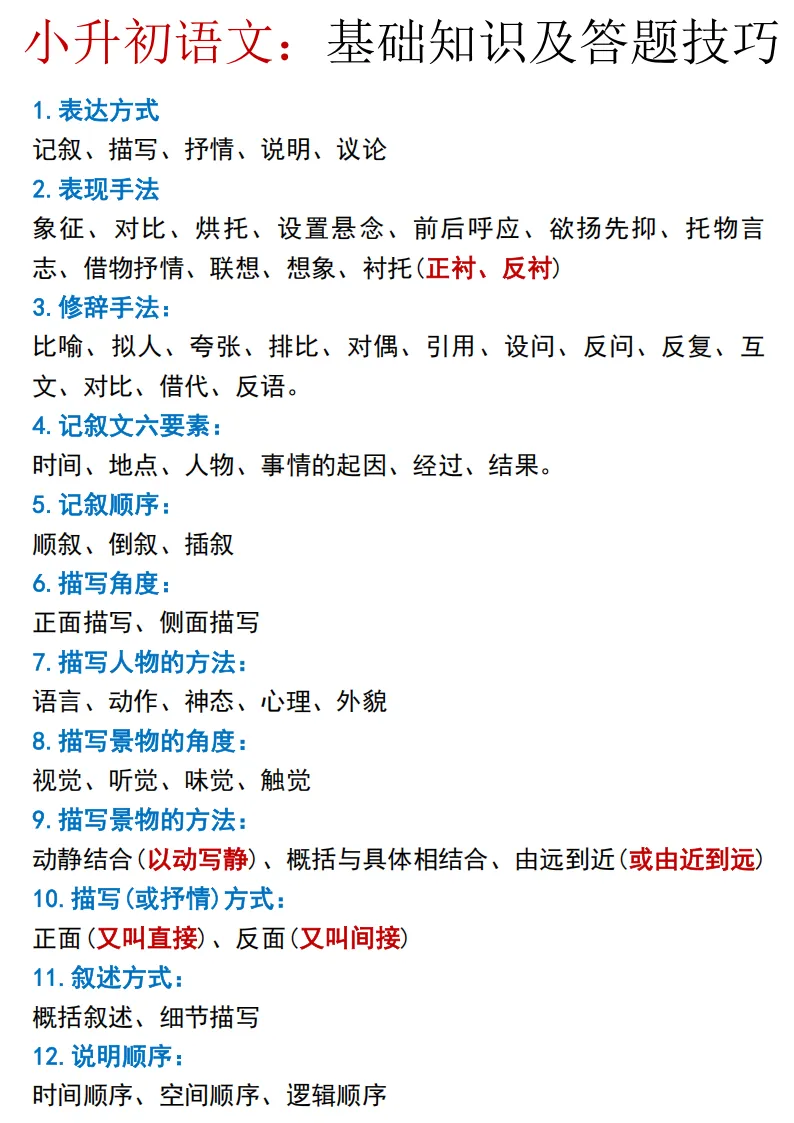 小升初语文阅读总丢分、答题不规范、知识点零散?这份资料把修辞、表达方式、答题格式全整理好,背会就能提分。