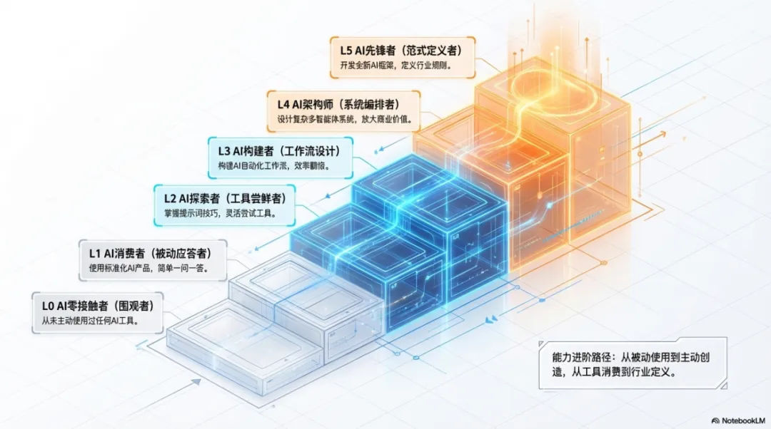 OpenClaw创始人Peter Steinberg、宾夕法尼亚大学Ethan Mollick教授、硅谷《创见 | Build Up》播客,共同描绘了一套从L0到L5的AI能力分级体系。