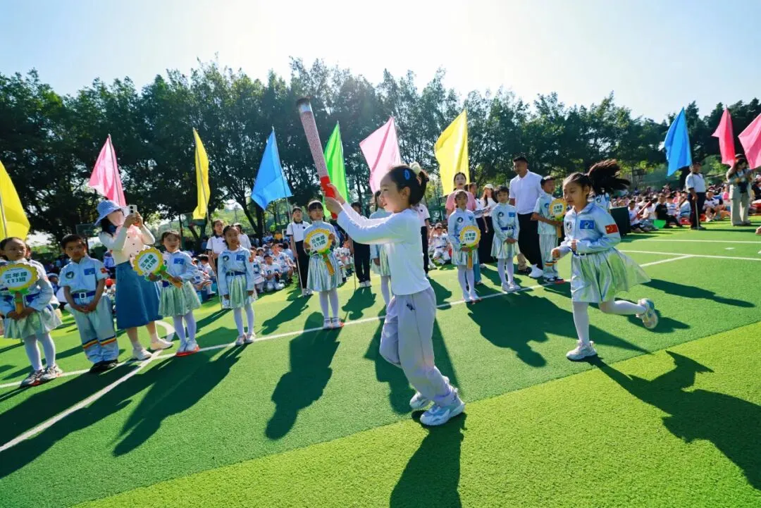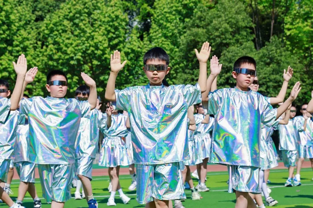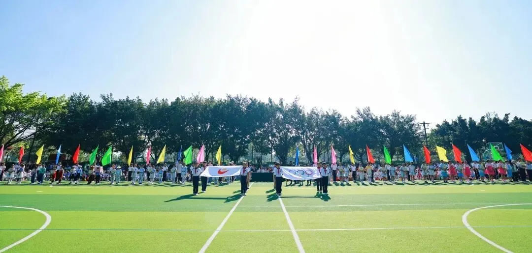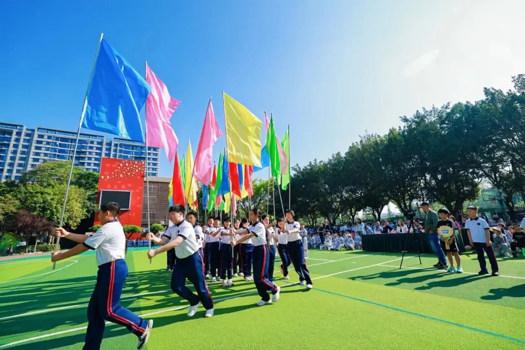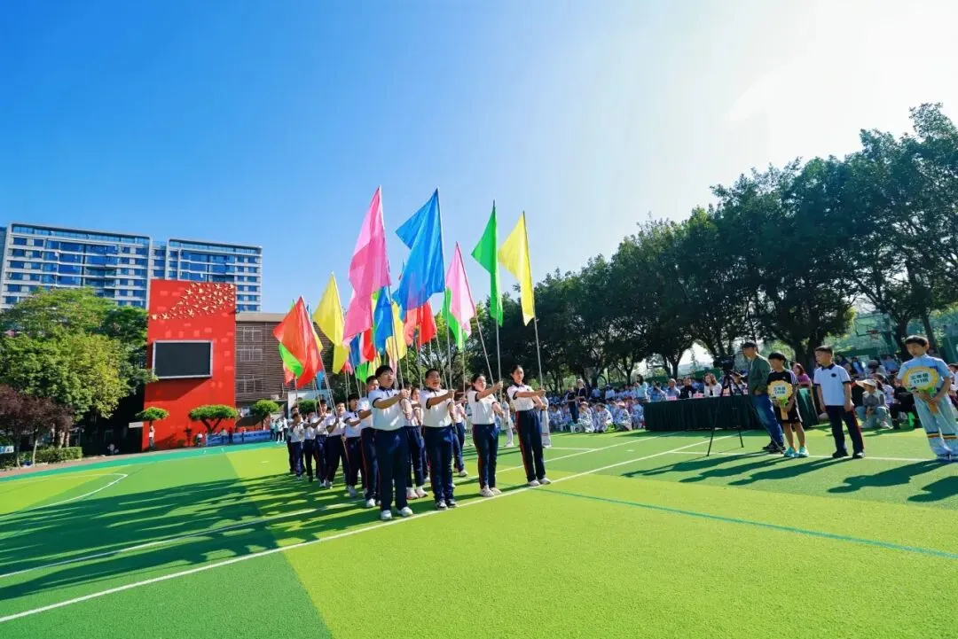 紧随其后的国旗队、五环旗队、校旗队尽显庄严与荣光:由体育老师组成的国旗队身姿挺拔,护卫国旗庄严入场;五环旗队诠释着“更快、更高、更强——更团结”的奥林匹克精神;印刻着学校初心与AI智慧的校旗迎风飘扬,承载着“成其所是,各耀其华”的办学理念,向阳而生。
