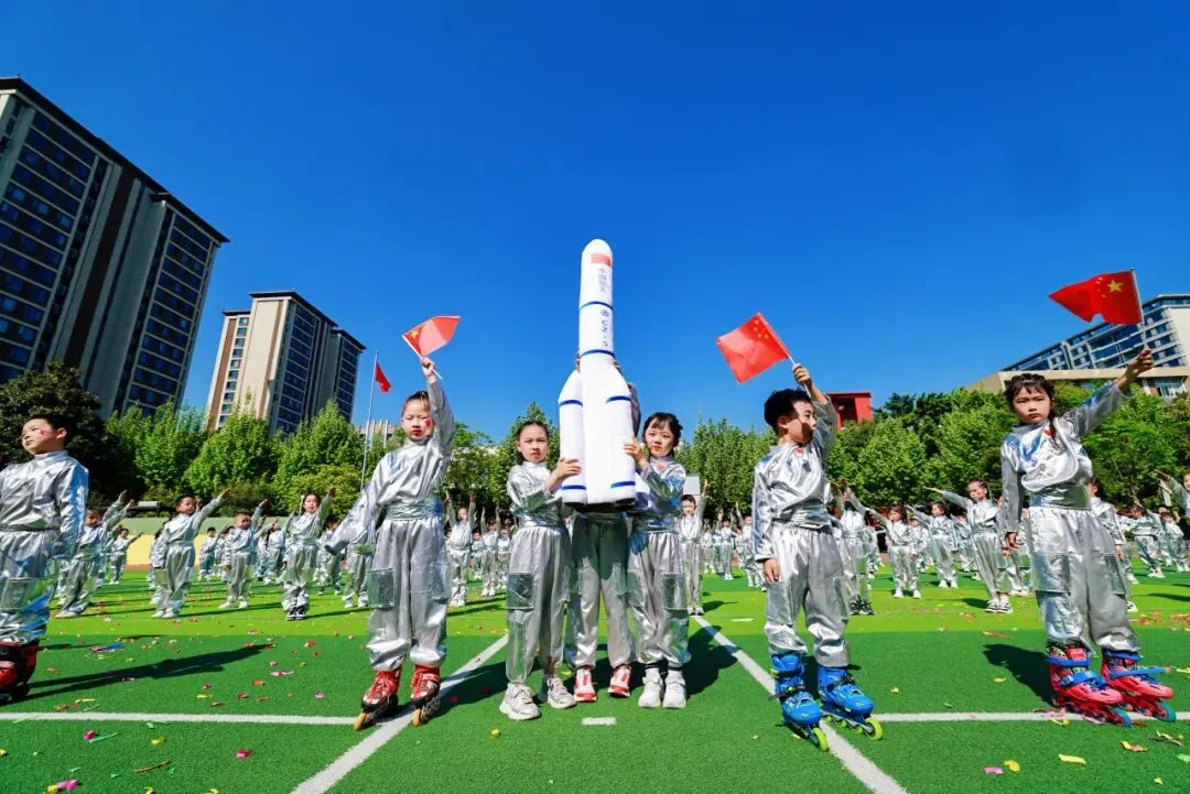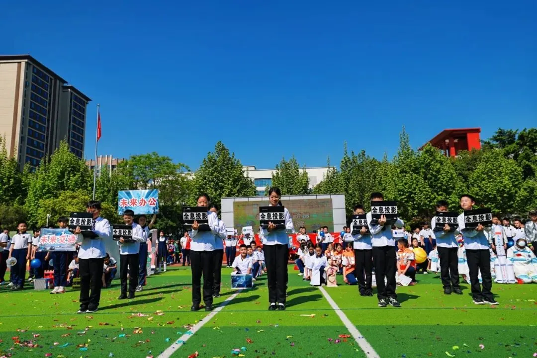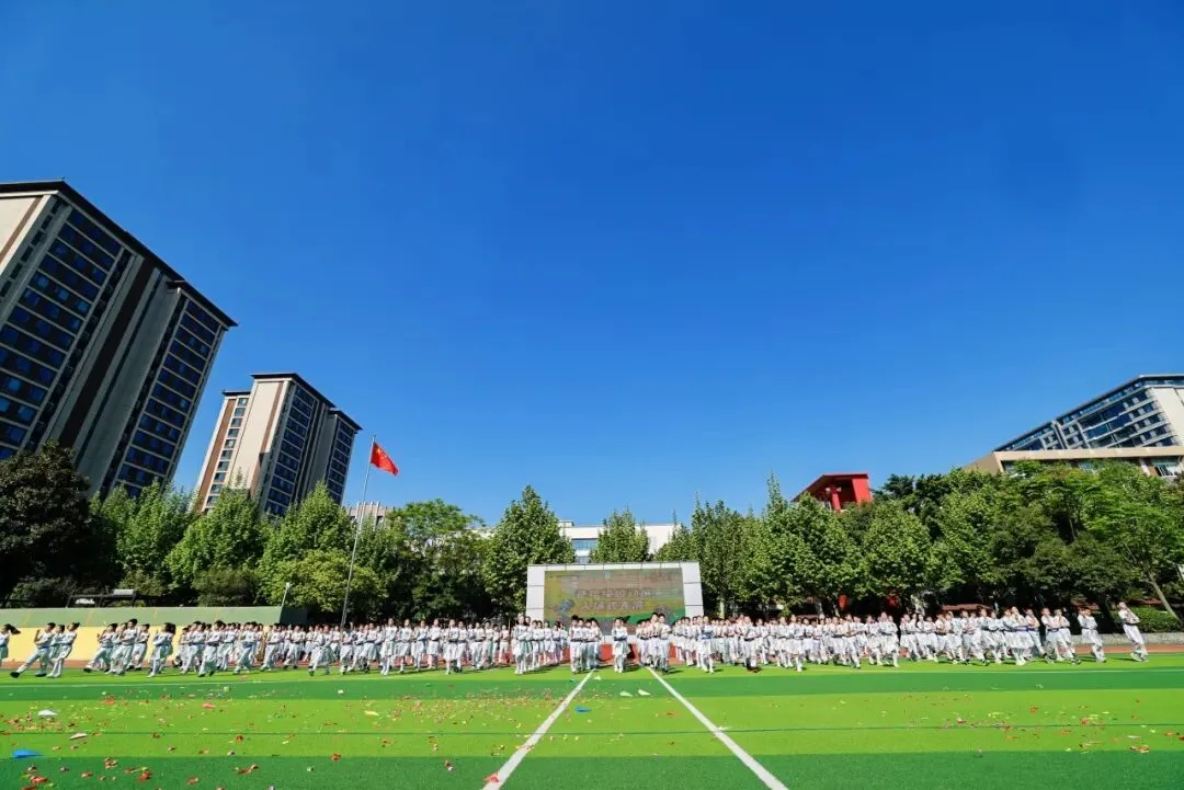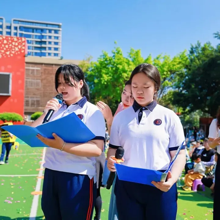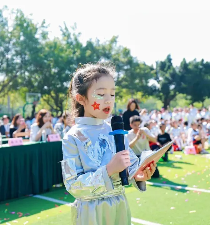 紧随其后的国旗队、五环旗队、校旗队尽显庄严与荣光:由体育老师组成的国旗队身姿挺拔,护卫国旗庄严入场;五环旗队诠释着“更快、更高、更强——更团结”的奥林匹克精神;印刻着学校初心与AI智慧的校旗迎风飘扬,承载着“成其所是,各耀其华”的办学理念,向阳而生。