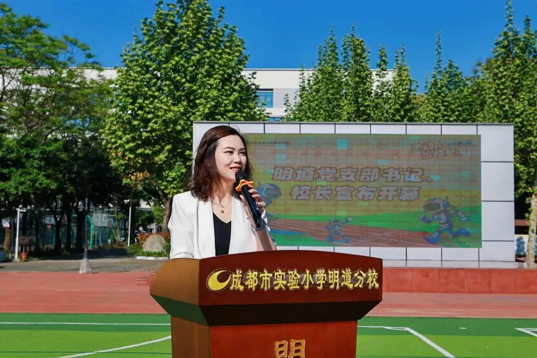 在全校师生的热烈欢呼中,成都市实验小学明道分校党支部书记、校长伍曲致开幕词并宣布运动会开幕。