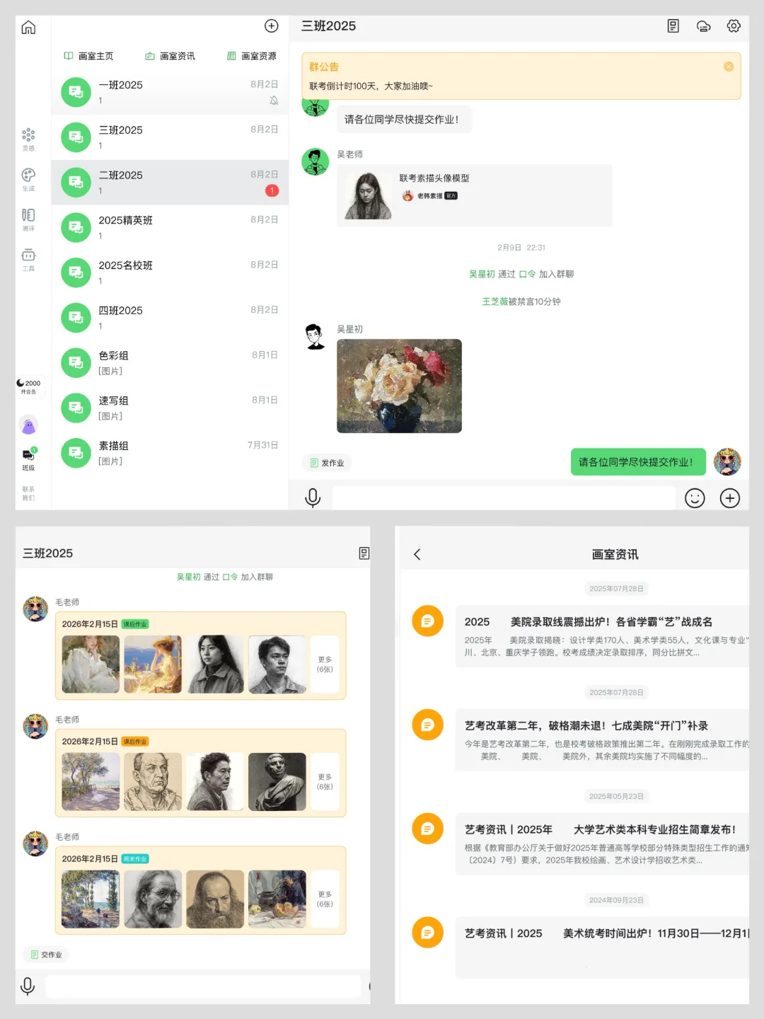 配套画室专属独立管理后台,专为画室打造的教学管理协同平台——画室可搭建专属主页、发布教学通知、上传教学资源、实时查看全画室学情数据;老师可实现班级作业管理、资源同步、学情沟通;学生可接收通知、获取资源、同步学习进度。