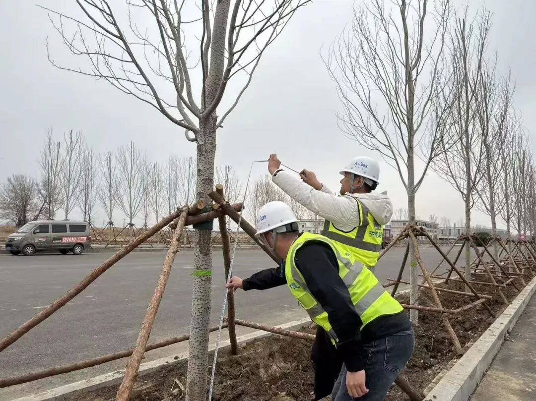在项目市政路绿化现场,项目管理人员正沿着道路逐段巡查新植乔木的栽种质量。他们对照设计图纸,仔细检查回填土夯实程度、支撑架牢固度及浇水围堰是否规整,在春日的路畔为城市生态建设增设一抹靓丽春光。
