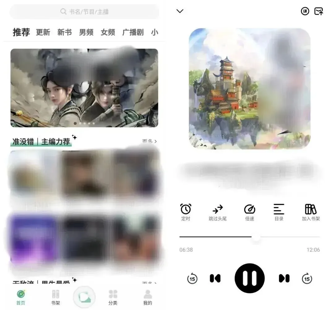 一款免费的听书软件,资源丰富,不用登录,全部免费。唯一的小缺点就是不支持下载,资源以网络小说、广播剧、相声评书、儿童故事为主,也有少量名著、职场、外语等品类,支持倍速、定时关闭、跳过片头片尾!