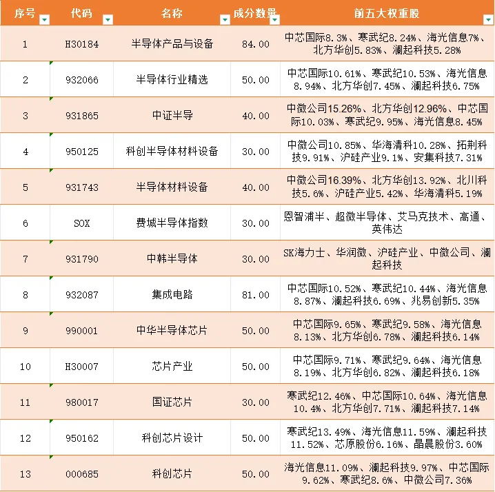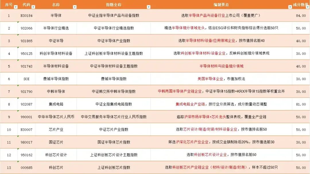 目前A股市场有13只半导体行业核心指数,涵盖了半导体、集成电路、芯片三大类,还包含费城半导体(SOX)、中韩半导体(931790)两只海外相关指数,覆盖中美韩全产业链。