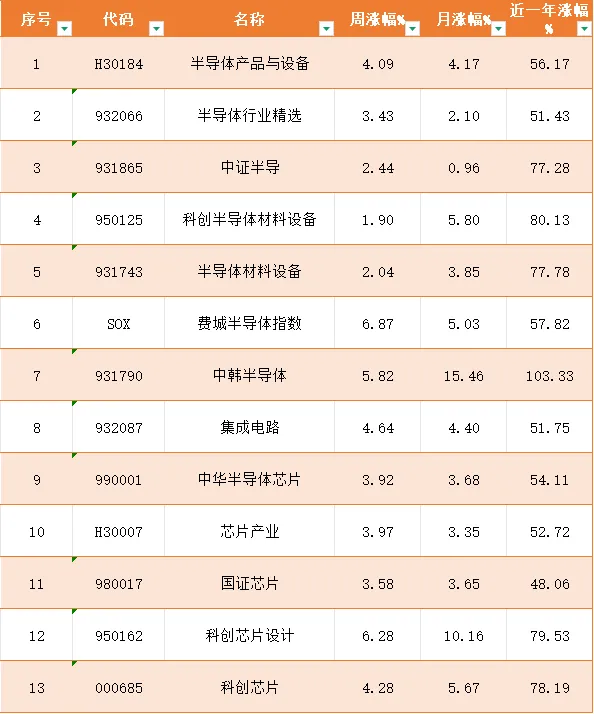 近一年:中韩半导体(931790)暴涨103.33%,成为最牛细分赛道;国证芯片(980017)涨幅48.06%,相对较低,内外市场节奏差异显著。