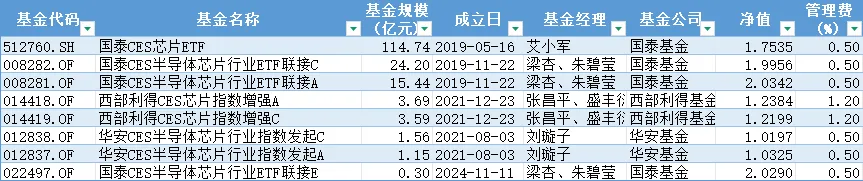 中华半导体芯片(990001):512760(国泰CES),规模114.74亿,覆盖全产业链