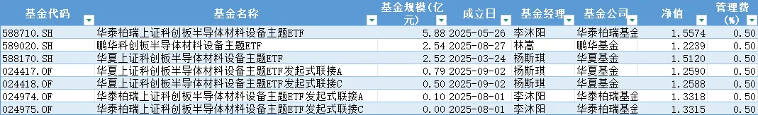 科创半导体材料设备(950125):跟踪科创半导体材料设备(950125)的有3只ETF:华泰柏瑞上证科创板半导体材料设备主题ETF(588710.SH)、鹏华科创板半导体材料设备主题ETF(589020.SH)、华夏上证科创板半导体材料设备主题ETF(588170.SH)