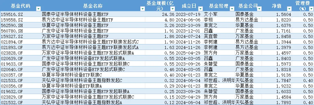 半导体材料设备(931743):跟踪半导体材料设备(931743)的有5只ETF:国泰中证半导体材料设备主题ETF(159516.SZ)、易方达中证半导体材料设备主题ETF(159558.SZ)、华夏中证半导体材料设备主题ETF(562590.SH)、广发中证半导体材料设备主题ETF(560780.SH)、万家中证半导体材料设备主题ETF(159327.SZ)