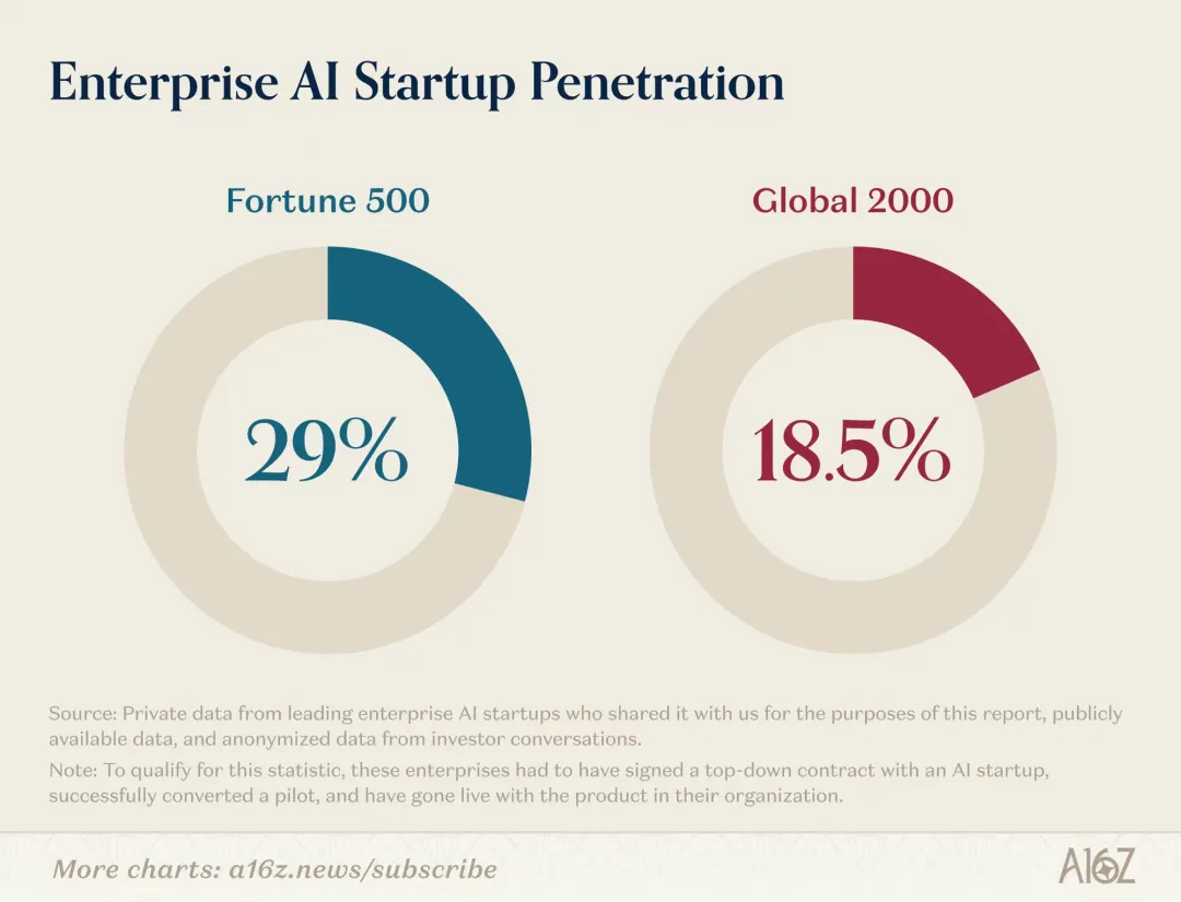 这一统计口径的标准是,这些企业必须与AI初创公司签订自上而下的正式合同、成功完成试点转化,并已在组织内部正式上线产品。在如此短的时间内达到这一渗透水平相当惊人,因为财富500强企业向来不以技术早期采用者著称。