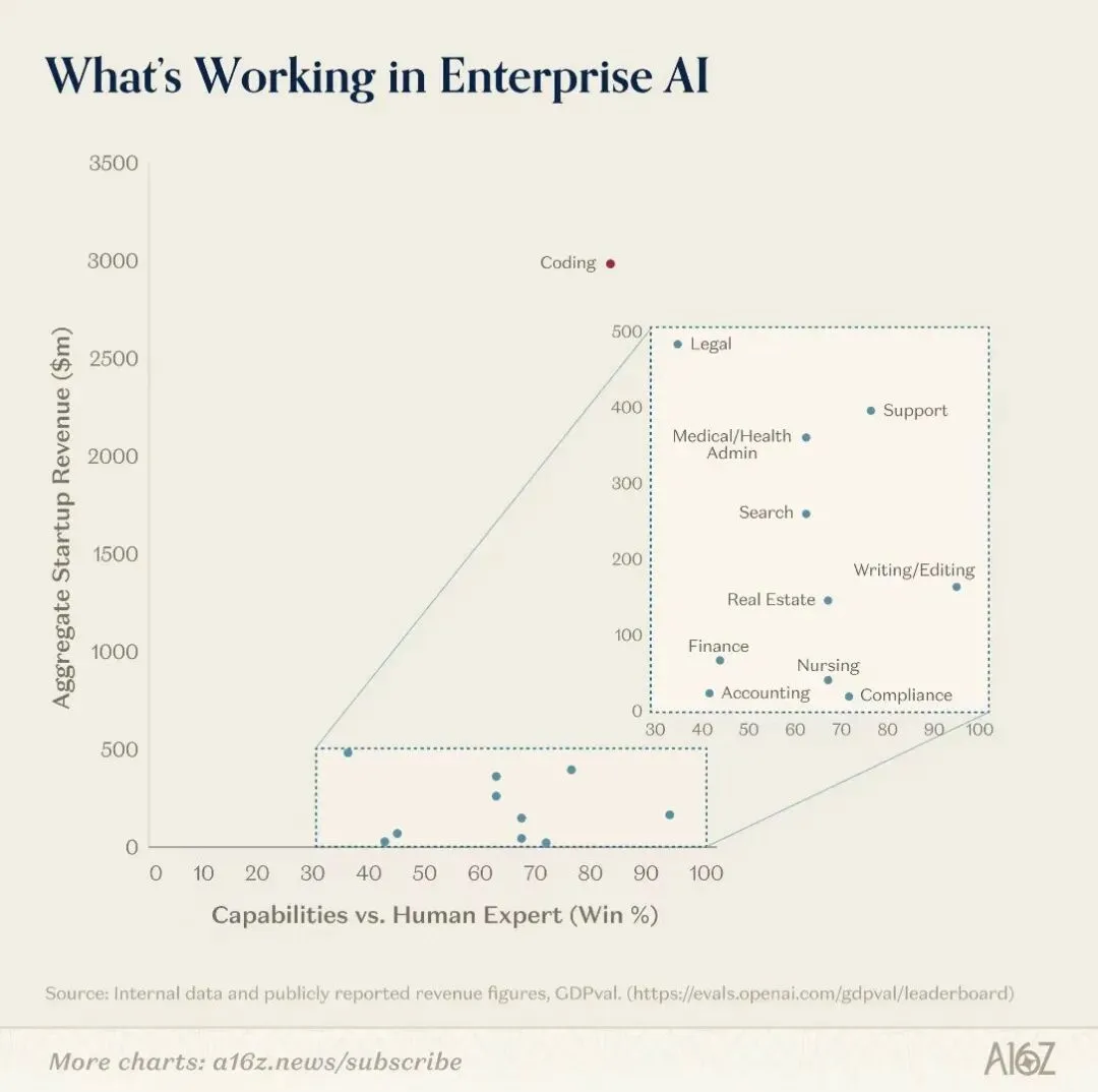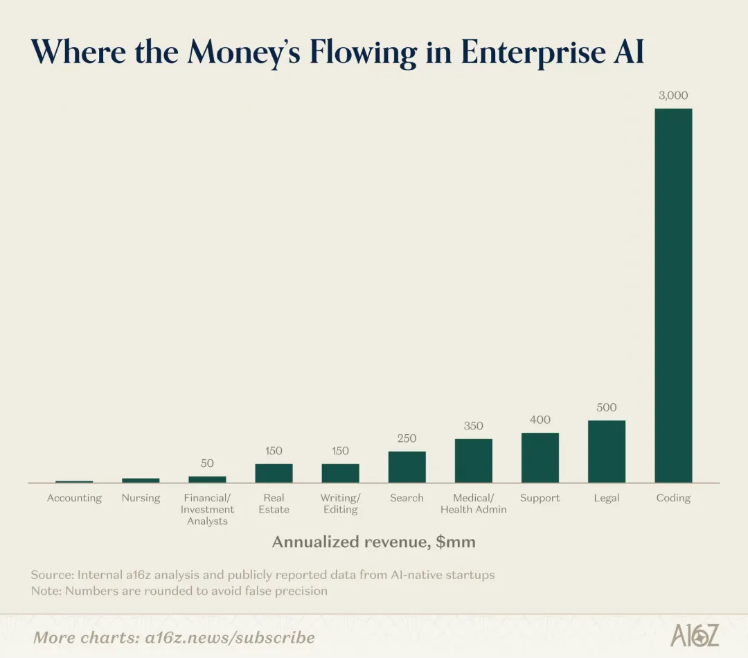 例如法律行业存在多种律师角色:公司法务、律所律师、专利律师、原告律师等,各自工作流与需求不同,仍有大量可切入空间。医疗行业同理,医生类型、医疗机构多样,机会同样分散。在这些领域之外,另一个有效思路是:关注模型能力快速提升、但尚未出现收入爆发式增长公司的赛道。