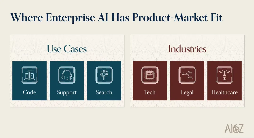 了解企业从何处获取价值、如何衡量投资回报,以及哪些行业需求明确、哪些行业即将爆发,能让AI构建者更清晰地判断机会所在。服务科技、法律、医疗客户目前显然是沃土,但我们不认为每个类别只会出现一个“赢家”。