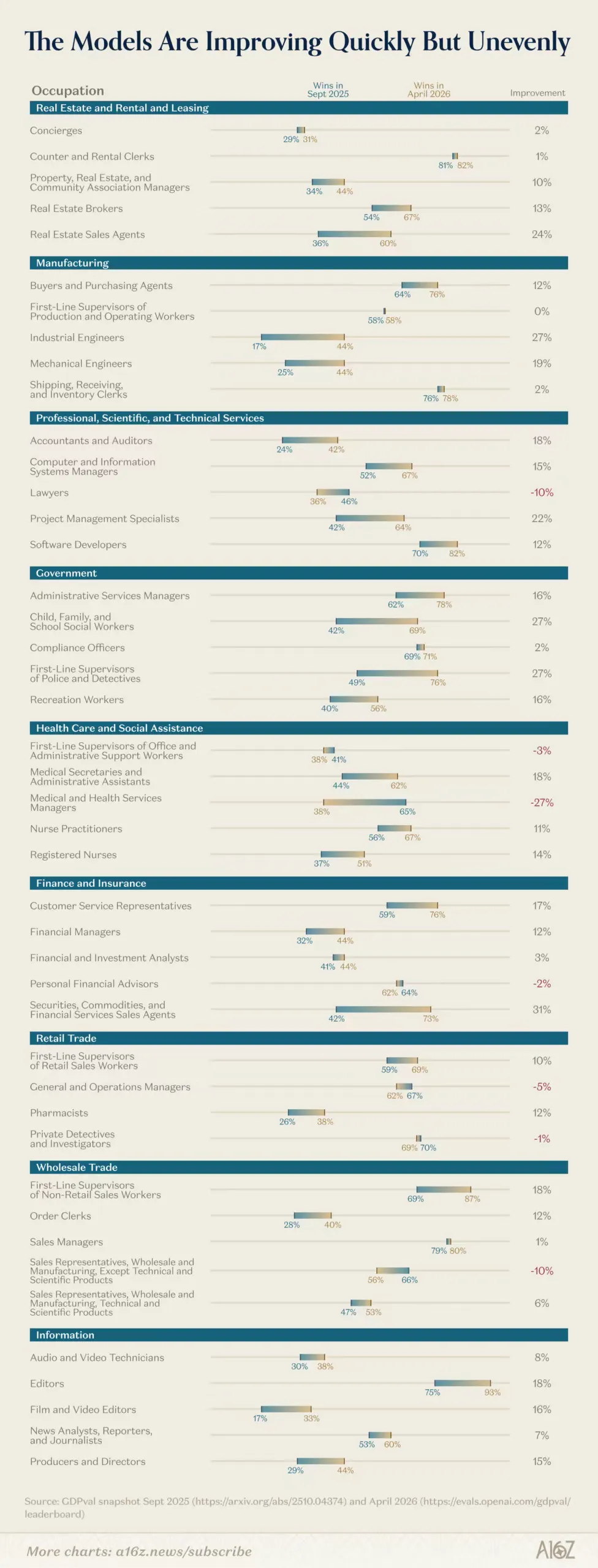 许多行业不具备这些特征:它们涉及物理世界、高度依赖人际关系、跨多方协调成本高、面临监管合规障碍,或缺乏可验证结果。尽管收入增长与模型能力明显相关,但在模型理论胜率低于50%的领域(如法律),Harvey等公司仍通过助手类产品迅速抢占市场,提升个体法律工作效率,并随模型迭代持续优化核心产品。最值得注意的发现是:模型能力提升速度极快。