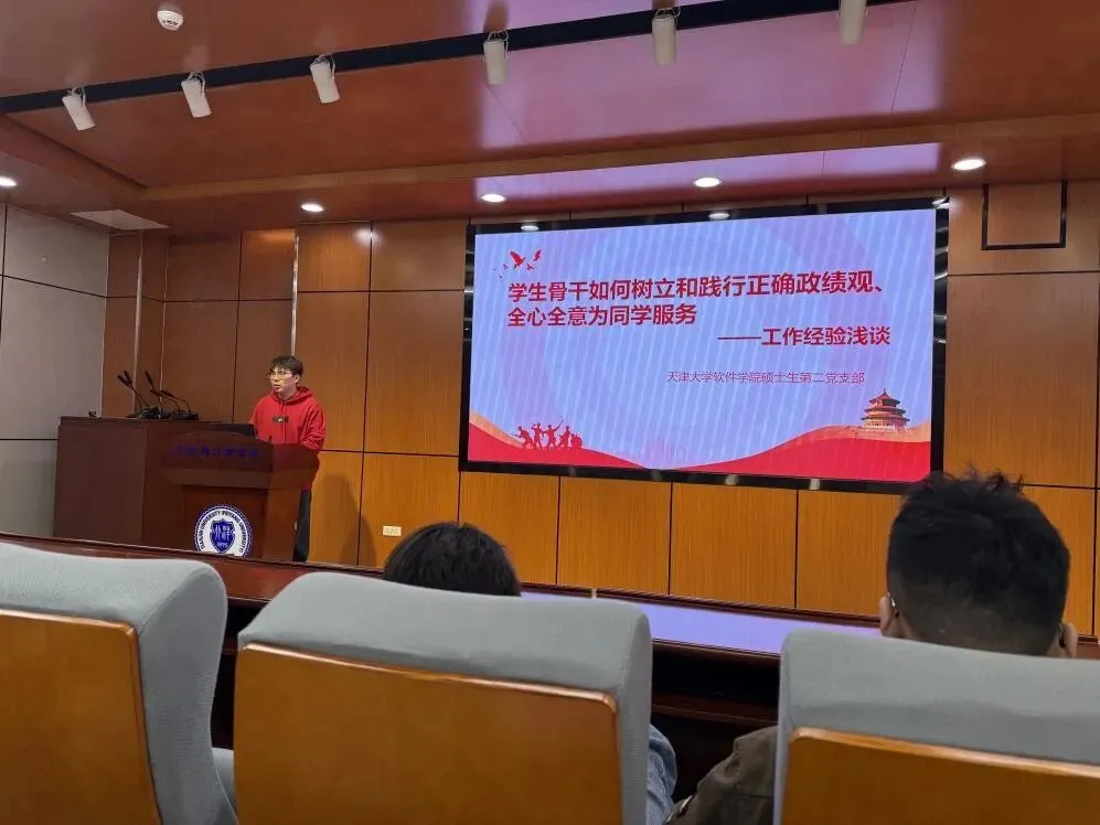 软件学院硕士生第二党支部孙家骏以《学生骨干如何树立和践行正确政绩观、全心全意为同学服务——工作经验浅谈》为题进行分享,他立足学生骨干本职工作,明确“做事为了同学、以同学收获感为出发点和落脚点”的核心宗旨,从宗旨定位、方案落实、发放创新三个维度,为在场学生党员提供了清晰指引。
