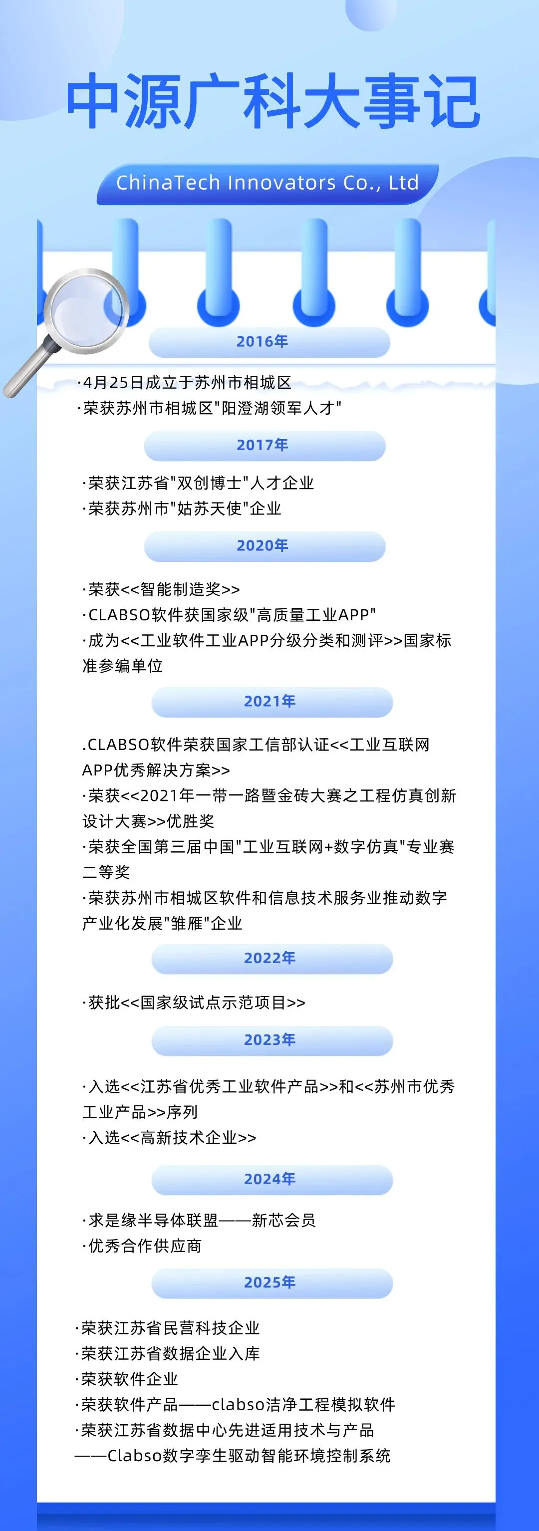 凭借扎实的技术与应用效果,CLABSO获得了业界广泛认可,相继入选2021年度工信部《2021年度工业互联网APP优秀解决方案》;2023年度江苏省《工业软件优秀产品》;2025年度苏州市《优秀软件产品》、江苏省《软件企业》、《江苏省数据中心先进适用技术与产品》、《江苏省数据企业入库培育》证书等等。
