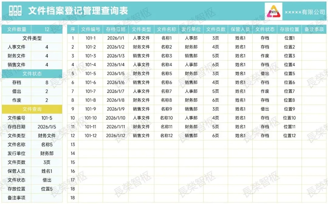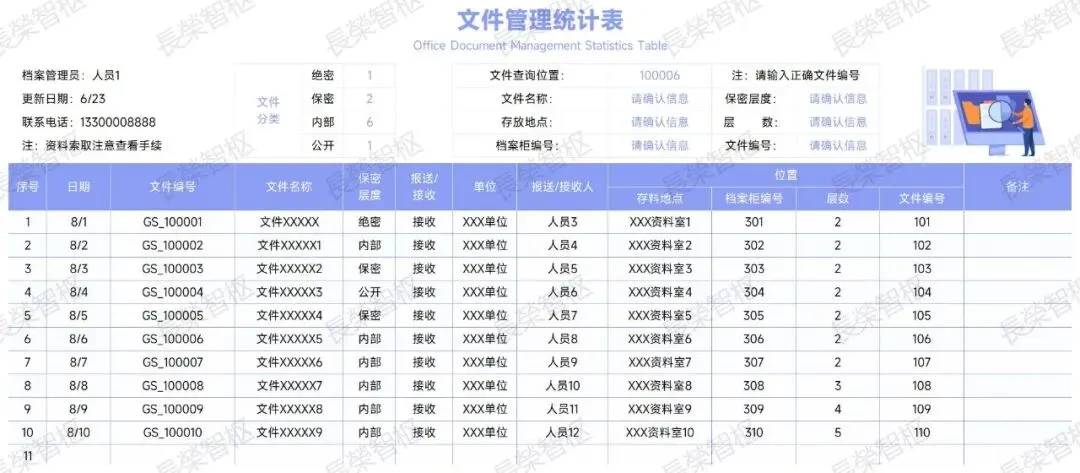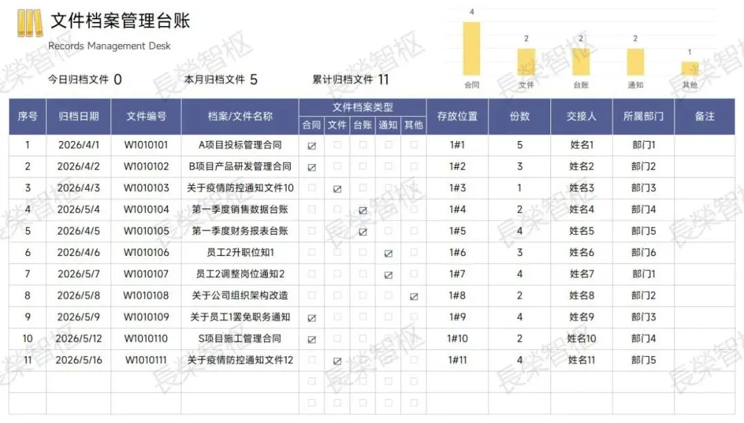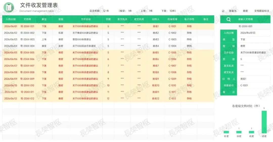 01 文档管理系统Excel模板:规范存档、清晰统计,文件流向一目了然,制作文档如合同、档案、制度等文件台账,高效管理各类文档资料。