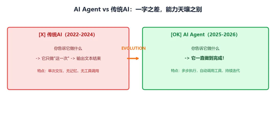 图1:AI Agent vs 传统AI — 一字之差,能力天壤之别