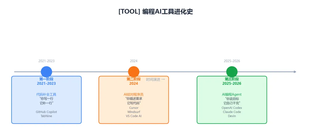 第一阶段 2021-2023 代码补全工具 "你写一行,它补一行" GitHub Copilot / TabNine | 第二阶段 2024 AI结对程序员 "你描述需求,它写代码" Cursor / Windsurf / VS Code AI | 第三阶段 2025-2026 AI编程Agent "你说目标,它自己干完" OpenAI Codex / Claude Code / Devin |