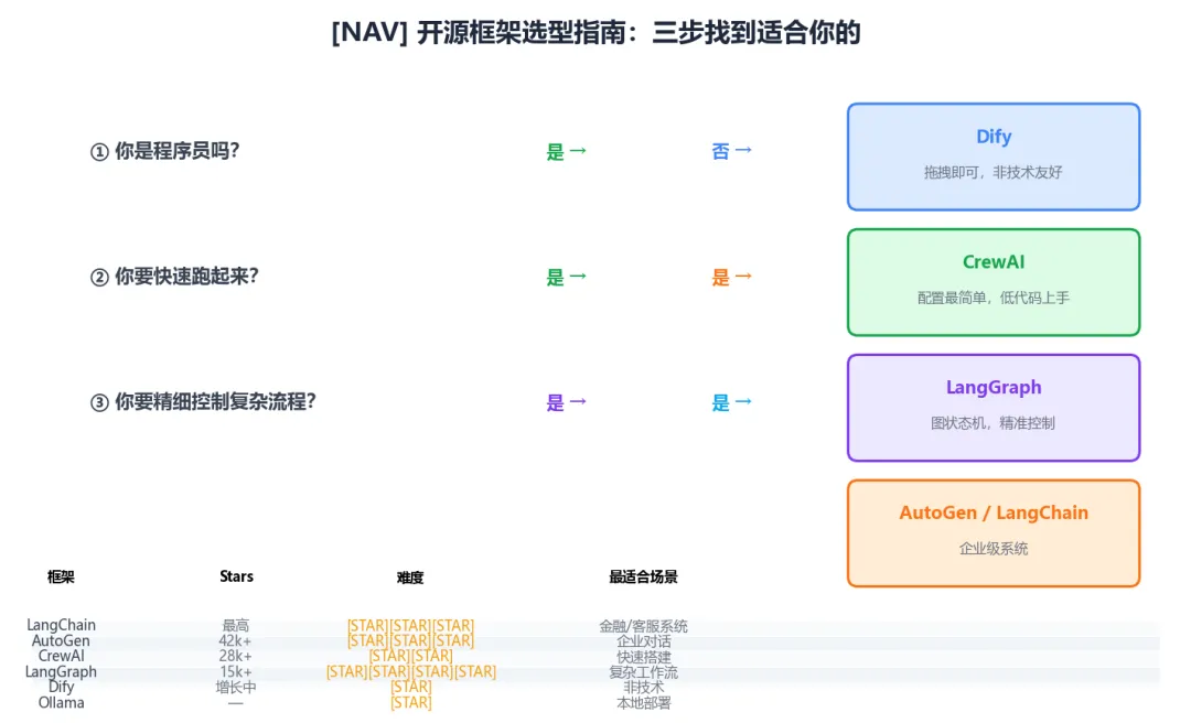 图5:开源框架选型指南 — 三步找到适合你的工具